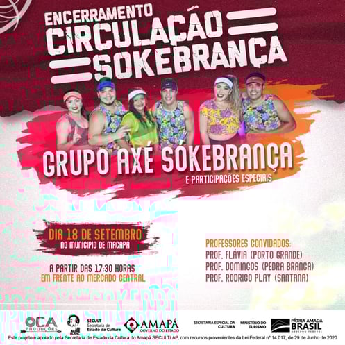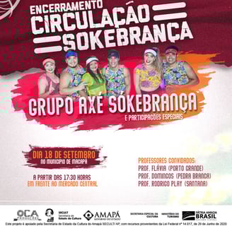 A “Circulação Sókebrança” já passou pelas localidades de Pedra Branca, Porto Grande, Santana (sede e Ilha de Santana). Neste sábado (18), a partir das 17h30, o Grupo e os professores convidados, Flávia (Porto Grande), Domingos (Pedra Branca) e Rodrigo Play (Santana) estarão em frente ao Mercado Central de Macapá para o encerramento deste projeto com uma grande aula de zumba para o público presente.